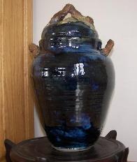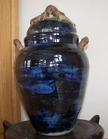 This jar was glazed and fired in an electric kiln. It is 15 inches tall and 9 inches in diameter. |