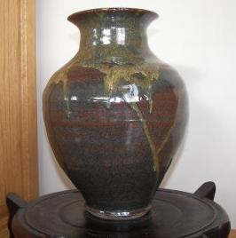 This vase is 11 inches tall by 8 inches in diameter. The vase was glazed and fired in a gas kiln.